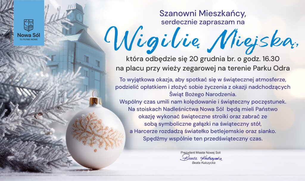 … gdy dzieją się cuda i wszystko zawsze jakoś się uda (…) Dziś wigilia jest, miłości wielki gest – słowami piosenki pt. „Dziś wigilia jest” serdecznie zapraszamy wraz z prezydent miasta Beatą Kulczycką na miejską wigilię, która odbędzie się w sobotę 20 grudnia