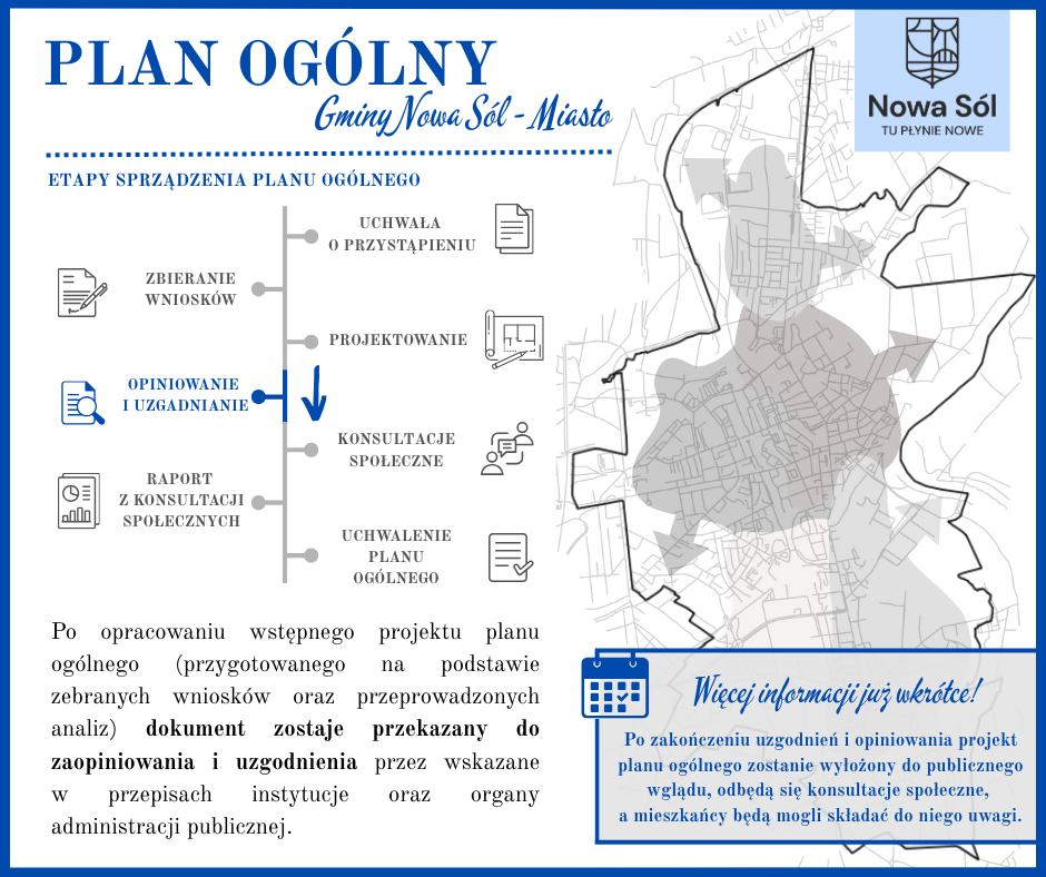 Zgodnie z art. 13i ust. 3 pkt 4 ustawy z dnia 27 marca 2003 r. o planowaniu i zagospodarowaniu przestrzennym (t.j. Dz. U. z 2024 r. poz. 1130 ze zm.), w Biuletynie Informacji Publicznej Urzędu Miejskiego w Nowej Soli udostępniono projekt planu ogólnego wraz z uzasadnieniem oraz prognozą oddziaływania na środowisko: PLAN OGÓLNY