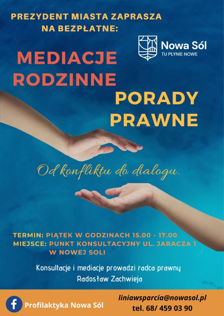 Mediacja to jedna z alternatywnych metod rozwiązywania sporów. Może zostać podjęta w każdej fazie sporu – przed sprawa w sądzie i w jej trakcie. Dzięki niej, możliwe jest zawarcie porozumienia, które uwzględnia interesy wszystkich skonfliktowanych stron.W mediacji nie ma przegranych Warto pamiętać, że trwanie w sporze jest niszczące dla wszystkich. Na drodze mediacji możesz rozwiązać swój problem, oszczędzając czas i pieniądze. Ponadto, masz wpływ na to, jaki będzie rezultat. Negocjujesz bowiem z udziałem bezstronnego mediatora, który pozwala osiągnąć porozumienie kończące konflikt. Mediacja to nic bowiem innego, jak rozmowa zwaśnionych osób, w której bierze udział w pełni bezstronna osoba trzecia (mediator), czyniąca starania, by zbliżyć stanowiska stron i wypracować miedzy nimi satysfakcjonujące je porozumienie, poszukując wraz z nimi dostępnych rozwiązań. Wśród zalet mediacji można wymienić: szybkość (znacznie większa niż w przypadku trwającego latami postępowania sądowego), poufność, dobrowolność (zawsze można odstąpić) poczucie bezpieczeństwa, nie jest konieczny bezpośredni kontakt między stronami, dostępność (dopóki nie zapadnie wyrok można wejść na drogę mediacji). Mediacje rodzinne oraz porady prawne pod hasłem „Od konfliktu do dialogu” są prowadzone w Naszym punkcie konsultacyjnym przy ul. Jaracza 1 w Nowej Soli. Dużym atutem mediacji rodzinnych w Naszym Punkcie jest to, że są one bezpłatne dla osób korzystających z naszych usług. Jeśli uważasz, że MEDIACJE są odpowiednia formą dla rozwiązania Twojego konfliktu – zadzwoń, zapytaj – umów się na spotkanie to nic nie kosztuje.