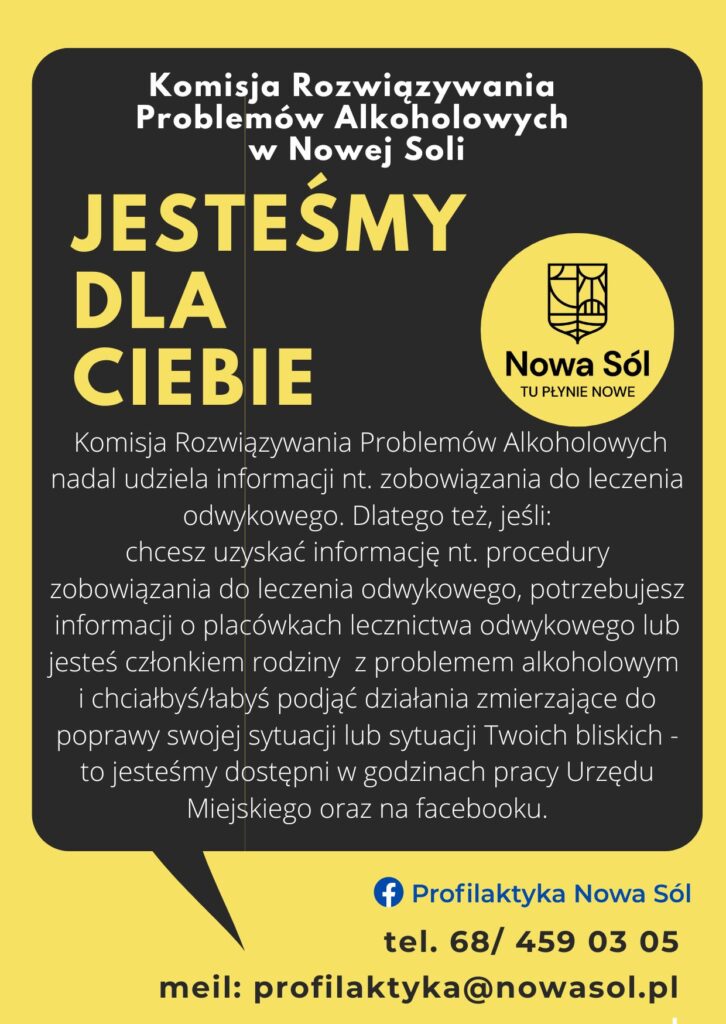 Komisja Rozwiązywania Problemów Alkoholowych w Nowej Soli podejmuje działania zmierzające do zobowiązania osób nadużywających alkoholu i spełniających przesłanki art. 24 ustawy o wychowaniu w trzeźwości i przeciwdziałaniu alkoholizmowi.Komisja RPA podejmuje działania wobec osób (dotyczy tylko mieszkańców miasta Nowa Sól), które w związku z nadużywaniem alkoholu powodują: rozkład życia rodzinnego, demoralizację małoletnich, uchylają się od obowiązku zaspokajania potrzeb rodziny, systematycznie zakłócają spokój i porządek publiczny. Wnioski o podjęcie działań wobec takich osób należy złożyć bezpośrednio w punkcie informacyjnym na parterze Urzędu Miejskiego adresując do Komisji RPA lub bezpośrednio w pok. 118. Jesteśmy dla Państwa pod numerem telefonu 68/ 4590305.